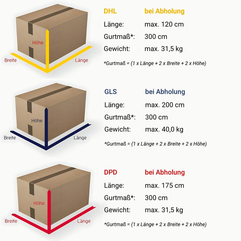 Bei Rücksendungen z.B. von Pfandartikeln vorrangig immer die Originalverpackung verwenden. Sollte diese nicht mehr vorhanden sein, dann achten Sie bitte auf das Gurtmaß der neuen Verpackung damit keine zusätzlichen Transportkosten bzw. Aufschläge entstehen. Wir übernehmen die Beauftragung der Abholung.