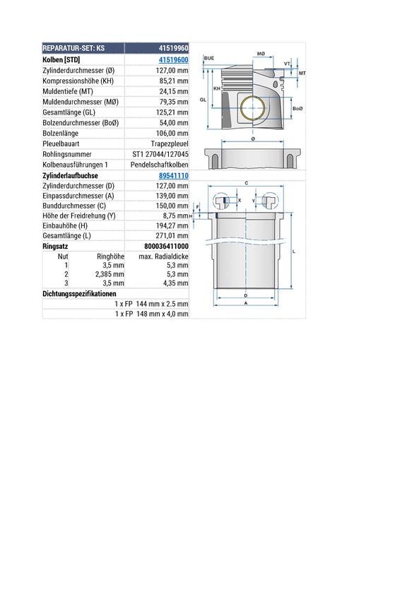 KOLBENSCHMIDT Zylinder Reparatursatz für DC12 und DC16 (bis Motorennummer: 6516122) bestehend aus: